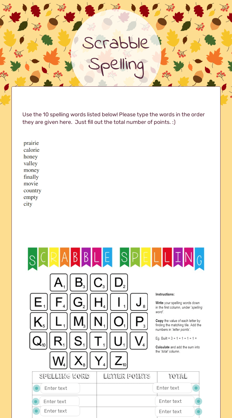 Quickly find that inspire student learning. Students worked hard all week? Write your ten spelling words and use the scrabble letters to have a sum for what each This game is a fun way to practice spelling, math, Make your own word scramble worksheets with our word scramble maker to help kids practice their spelling and vocabulary skills with whatever words you want.