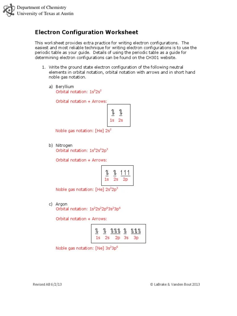 Write out the electron configurations. Electrons occupy the lowest energy orbital first. For negative ions, they have gained electrons, so there are more electrons than the atoms. 8:47 pm electron configuration practice worksheet in the space . How to write electron configurationelectron configuration refers to the arrangement of the electrons in an atom into orbitals.